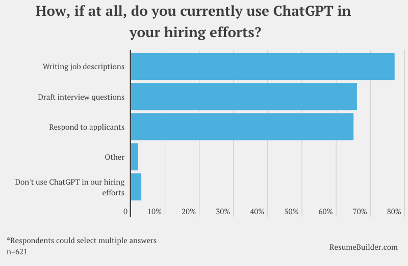 大多数公司还使用 ChatGPT 来协助招聘。77% 的受访者表示,这有助于他们撰写职位描述,66% 的受访者用 ChatGPT 起草面试申请,65% 用于回复求职者。