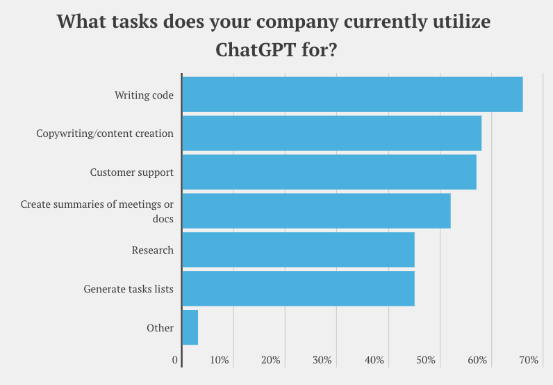 在目前使用 ChatGPT 的公司中,66% 将其用于编写代码,58% 将其用于文案/内容创建,57% 用于客户支持,52% 用于创建会议或文档摘要。