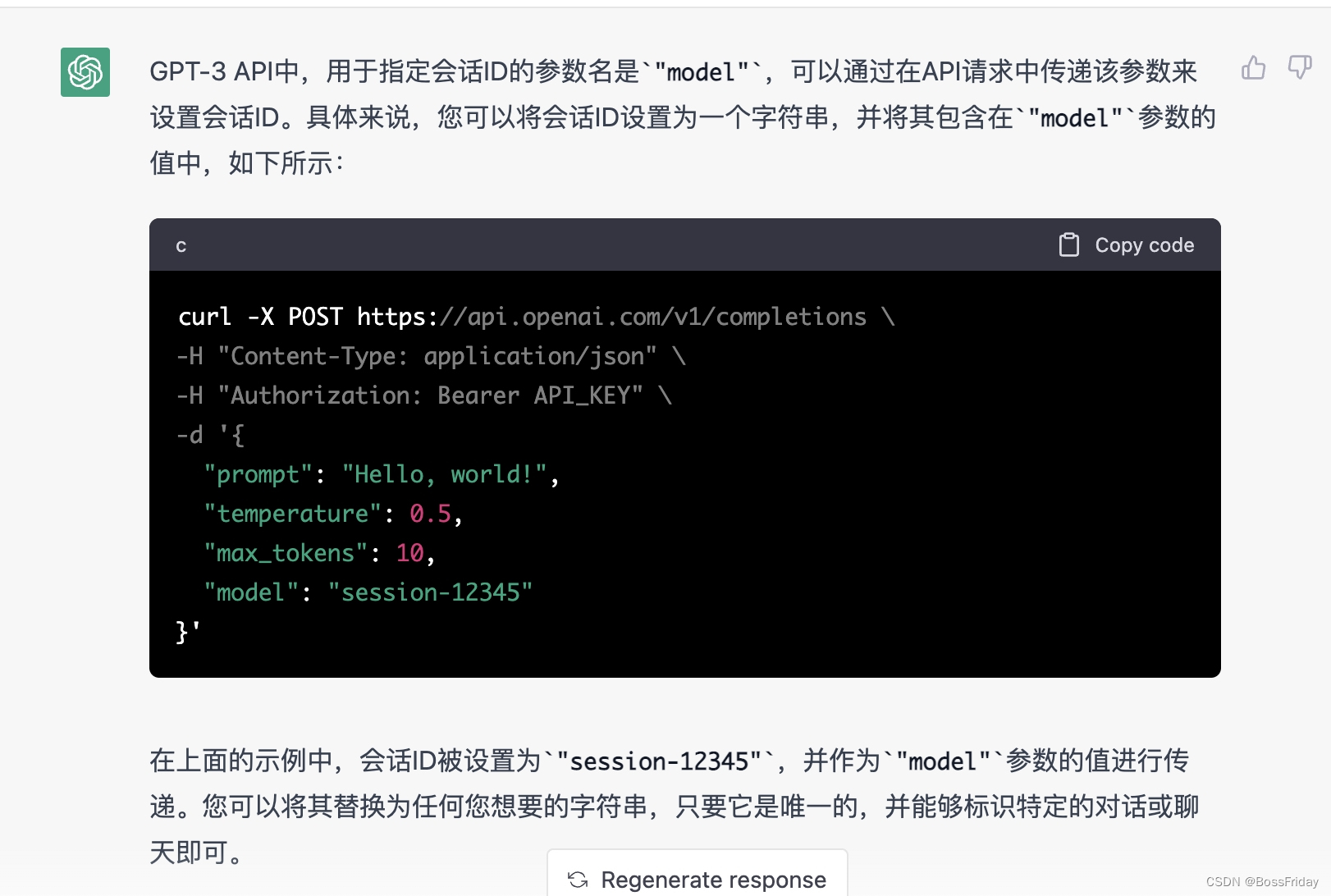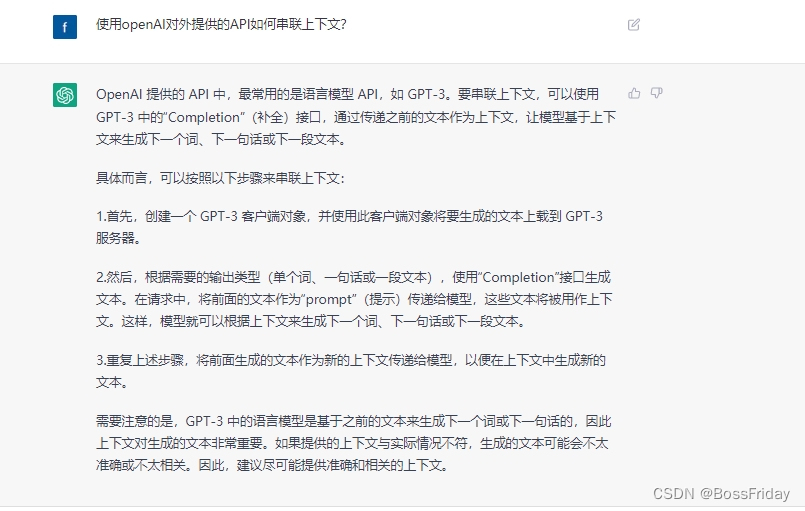 从上面我贴的API请求/响应的示例中我们可以看出:好像没有什么地方可以表达会话信息。那么如何使用API如何串联上下文呢?由于没有快速找到相关说明,于是我直接问了ChatGPT自己,得到的答复是: