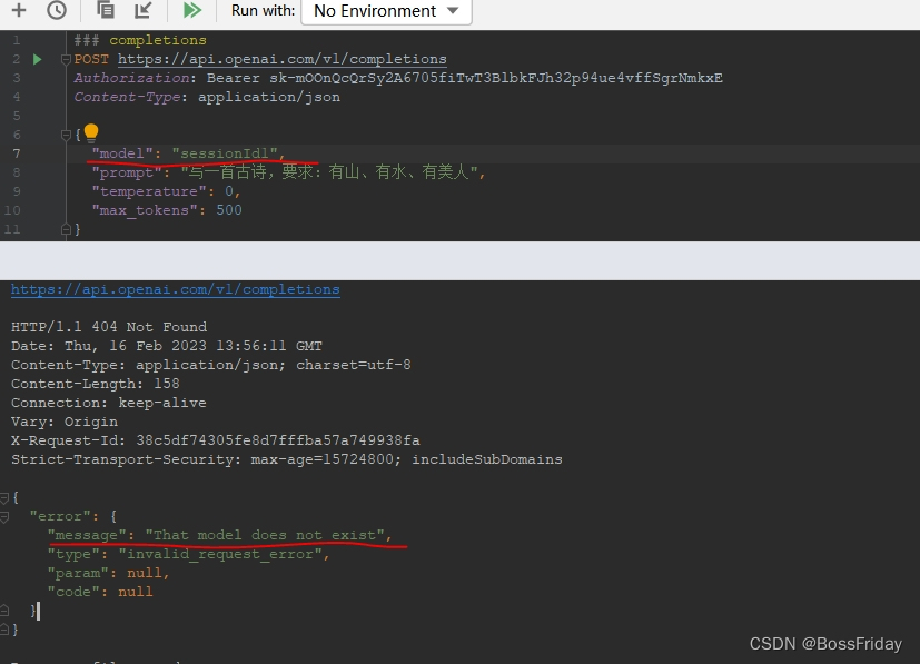 为什么说错误了呢,因为model参数其实是用来表达自然语言处理模型的(前面讲了目前其官方只是提供了对text-davinci-003模型的API)。以下是我做的一个测试,明显可以看出不能用该字段去表达会话ID: