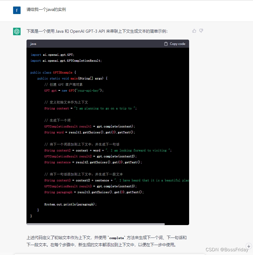 上面的文字回答可能有些地方存在二意行,于是我接着直接让chatGPT给出java代码。从下面的代码就能看出:串联上下文其实就是简单暴力的将前面的问答内容不断的累加到后面的问题中