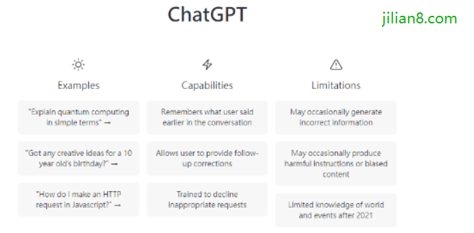 登入之后,首先你会来到 ChatGPT 的使用手册画面。在画面中,他告诉你该如何与 ChatGPT 进行对话,还有他能够怎么样与你回应,以及它的限制之处在哪。