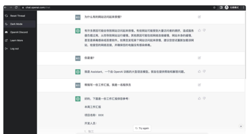因此,你可以通过同一个机器人不断的向他进行灵魂拷问,他会是基于你前面所提供的问题与回答,来继续后续的回应。如果你对于他当前的回应不满意,那么还可以在他回答完毕问题后,点选下方的Try again让他重新回答,基本上他都可以换成另外一种角度与方式来回应你原本的问题:
