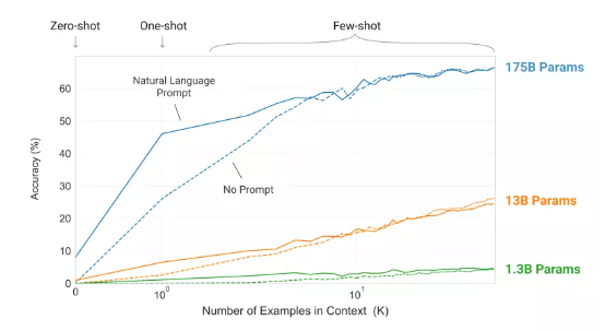 GPT-3 论文提到,参数在 10 亿至 1000 亿级别的模型只需几十个提示词,即可展示出令人印象深刻的学习能力。