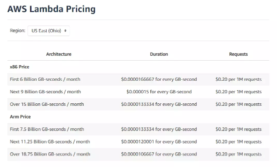 下面来看 AWS Lambda 部分的成本,它的价格由内存用量和请求频率决定。