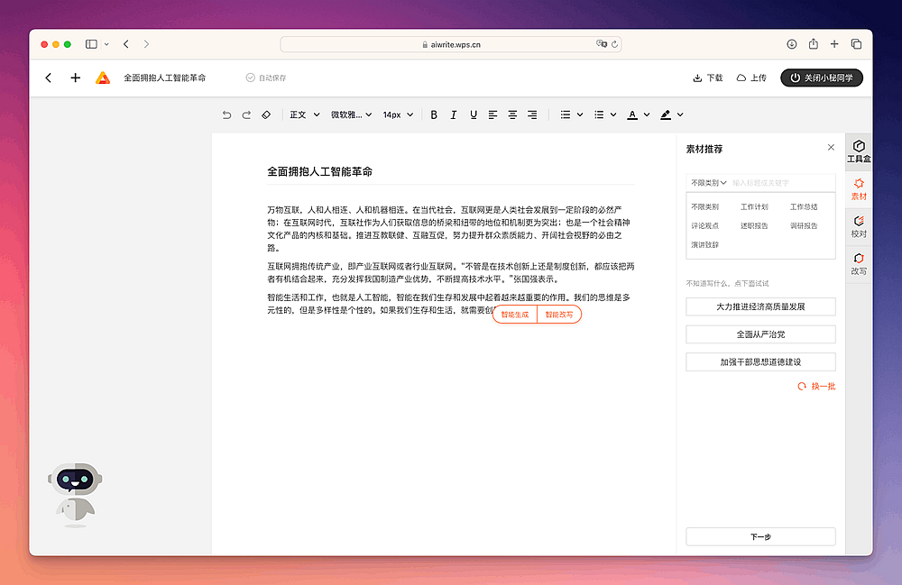 10、WPS智能写作:1秒自动生成各类文章