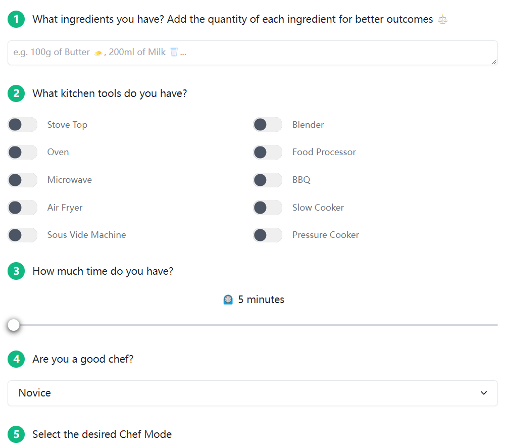 这是一款AI食谱推荐工具,当用户输入手上现有的食材和工具,以及预留的做饭时间,它就能推荐出一款满足需求的食谱。