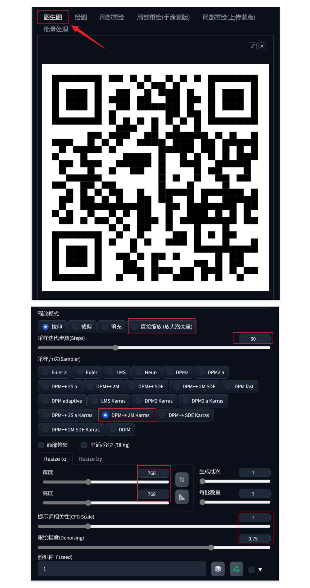 向下滑动,在「图生图」选项卡内上传我们的二维码,并进行相应的参数进行相应的设置