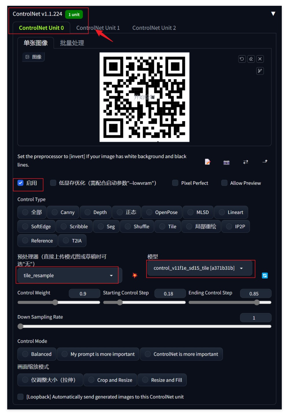 继续向下滑动至 Controlnet 界面,再次上传我们的二维码,勾选「启用」,预处理选择 tile_resample,模型选择对应的 tile 模型。后续的三项参数仅供参考,具体数值在实际应用中可以灵活微调: